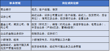 学生毕业后可进入商业银行(含城商行)、政策性银行、金融监管部门、证券公司(含基金管理公司)、信托投资公司、金融控股集团、四大资产管理公司、金融租赁、担保公司、保险公司等金融机构、政府部门、事业单位,从事金融产品的开发与操作、风险管理、公司和个人理财等工作,亦可进入上市(欲上市)股份公司证券部、财务部、证券事务代表等部门进行与有价证券相关的工作。